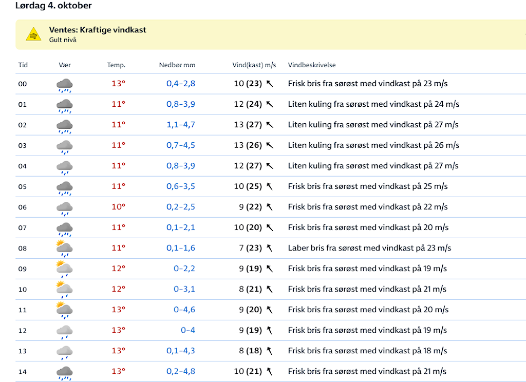 Meteorologene melder om mye vind og regn fra fredag kveld og utover lørdag. Vi har tett kontakt med Meteorologisk Institutt og vil følge utviklingen nøye. Merk at store deler av løypen ligger i le for vinden. Det blir vått og vindfullt, men ikke like mye som i indre strøk, på fjellet eller langs kysten. Anbefaler alle deltagere å forberede seg på varierende værforhold og kle seg deretter.